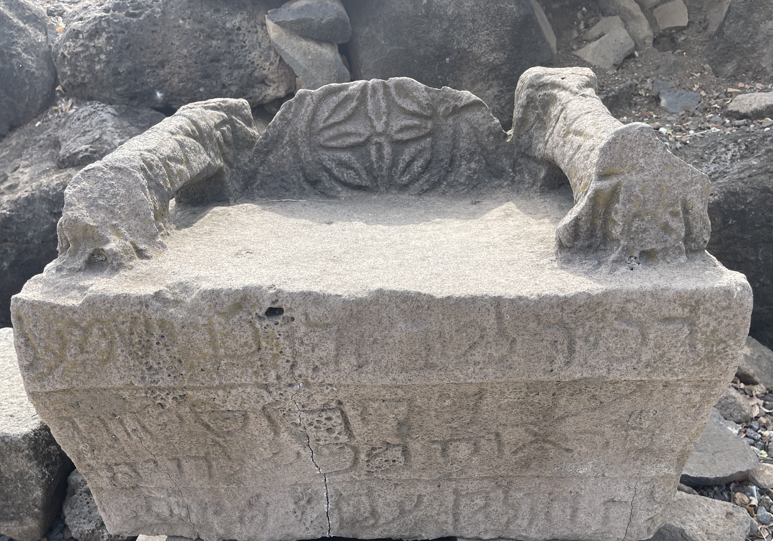현무암으로 만들어졌고, 아람어로 기증한 사람의 이름이 새겨져 있는, 회당에서 고위급 인사들의 자리로 사용된 모세의 자리~